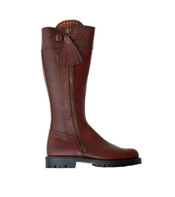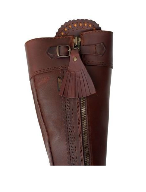 Bota con cremallera en el lateral exterior, con una altura de 40 cm, piel de Ternera Oscura de primera calidad engrasada, forro piel de ciervo y piso Vibram empalmillado.
