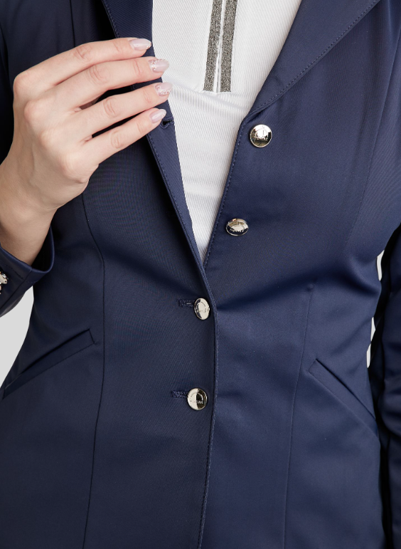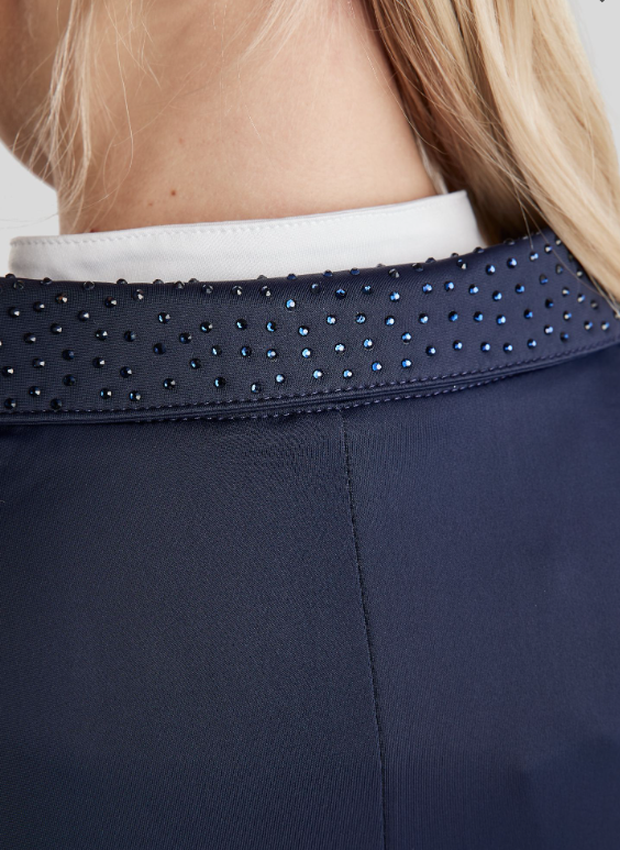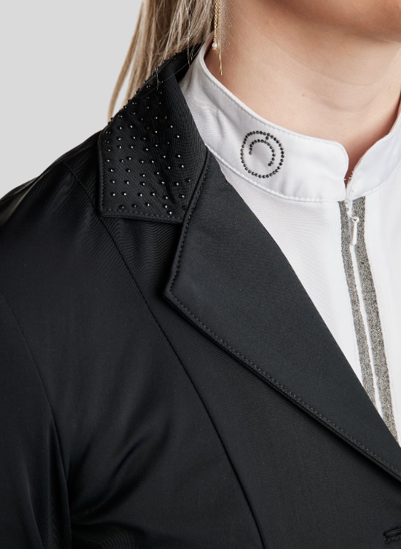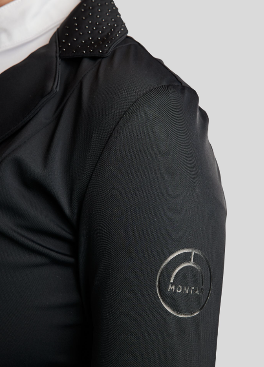 Ofrece una silueta elegante con detalles refinados que elevan tu look general. El cuello clásico está sutilmente adornado con cristales tono sobre tono, añadiendo un toque de glamour discreto. Los elegantes botones con el logotipo de Montar y un logotipo exclusivo en la manga izquierda proporcionan un acabado profesional y pulido. Dos prácticos bolsillos frontales te permiten tener tus objetos esenciales a mano.