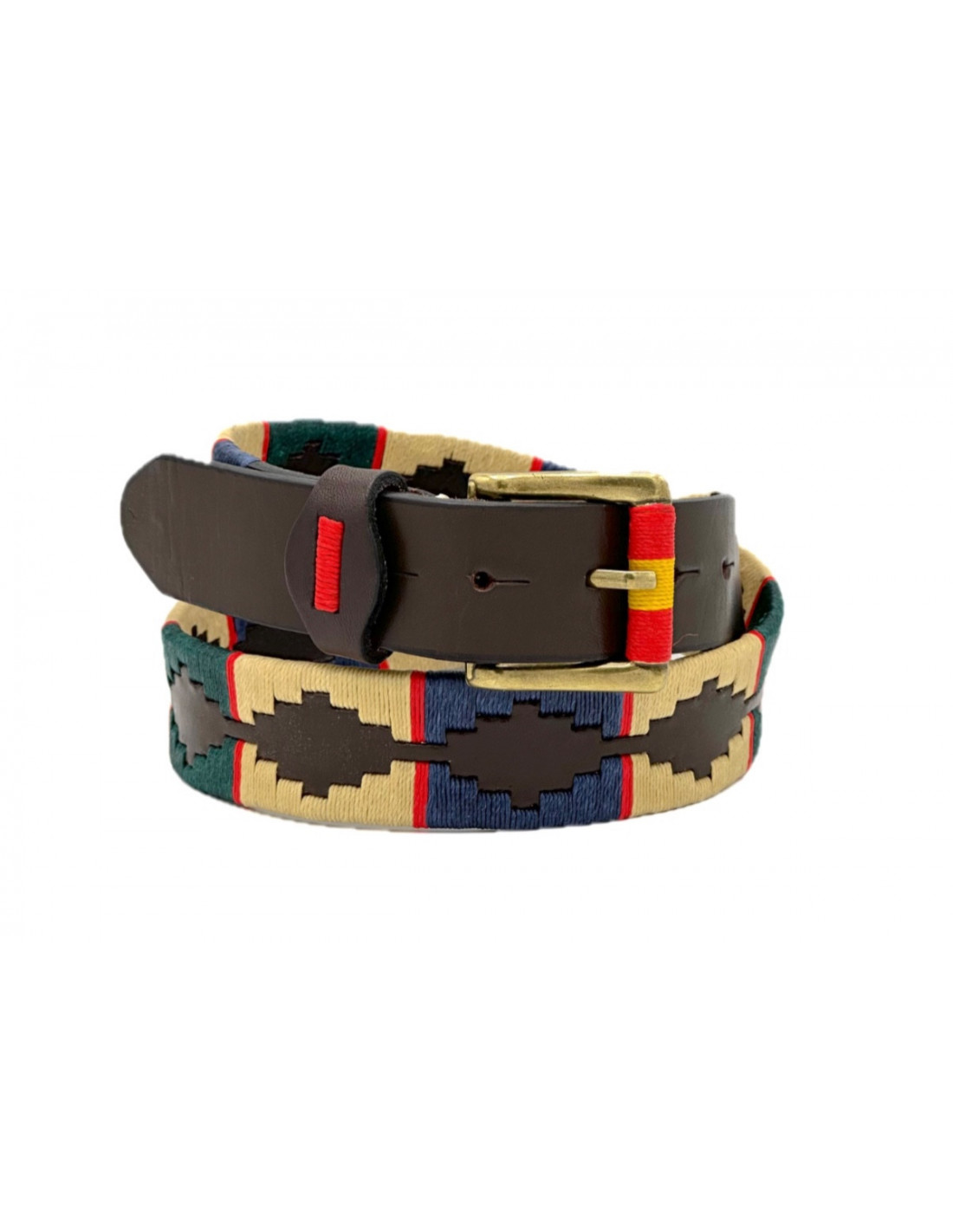 Cintrón con base de color marrón y bordado de cenefas con 3 colores.