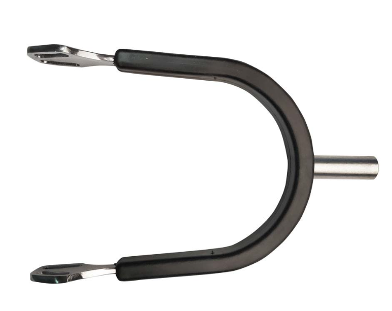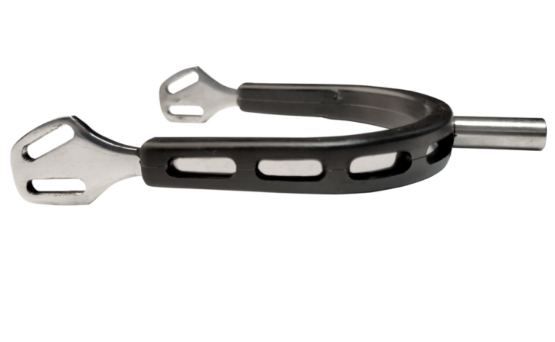 Espuela unisex de acero inoxidable. Lleva incorporado un protector de goma negra antideslizante.