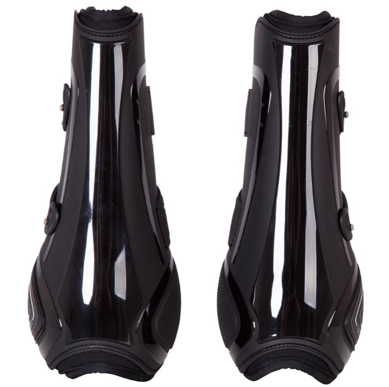 El exterior de poliuretano con forma anatómica proporciona una protección óptima a la pierna del caballo. El interior está forrado con neopreno suave que absorbe los impactos. Los cierres rápidos de goma con correa elástica se pueden asegurar fácilmente y son ajustables en tres posiciones.