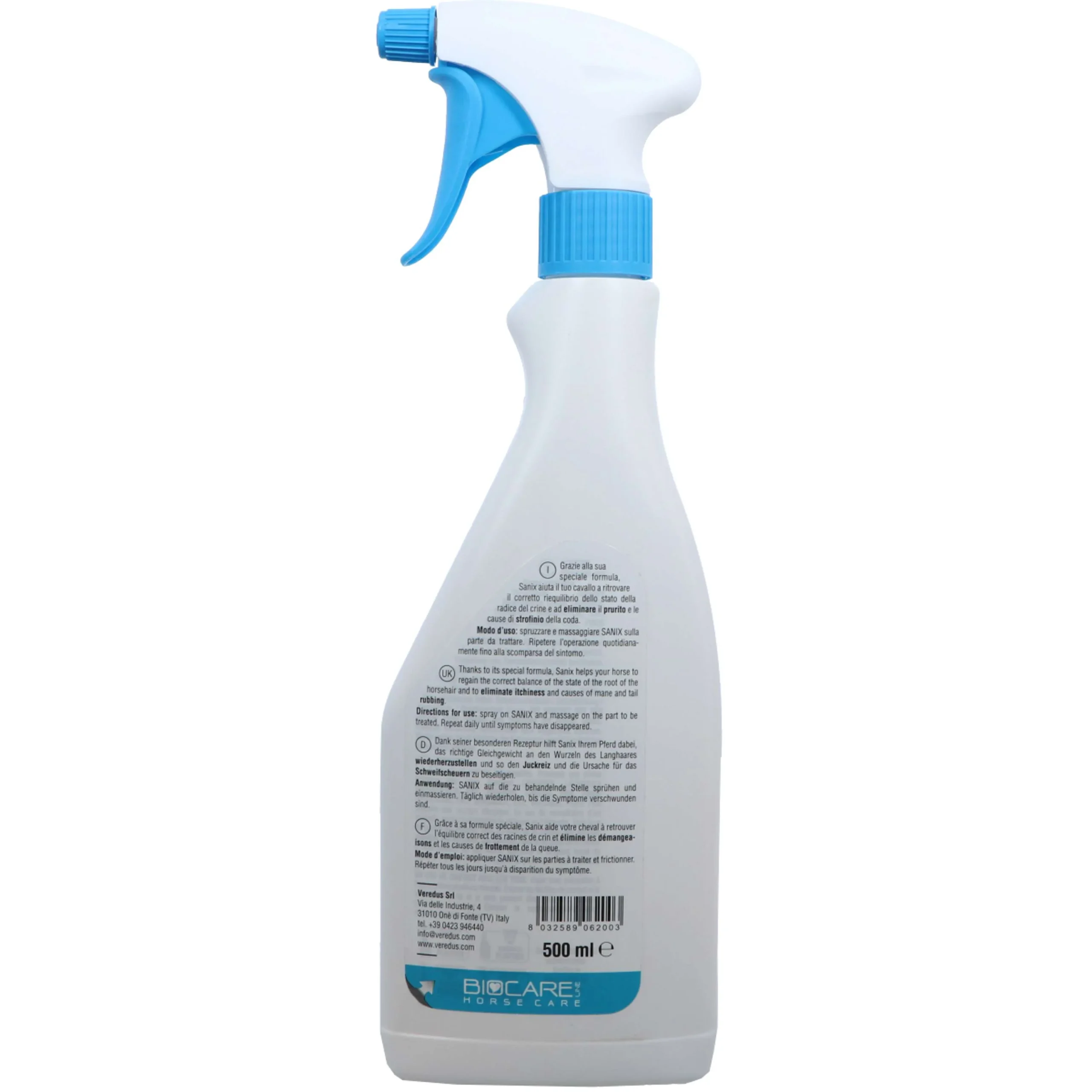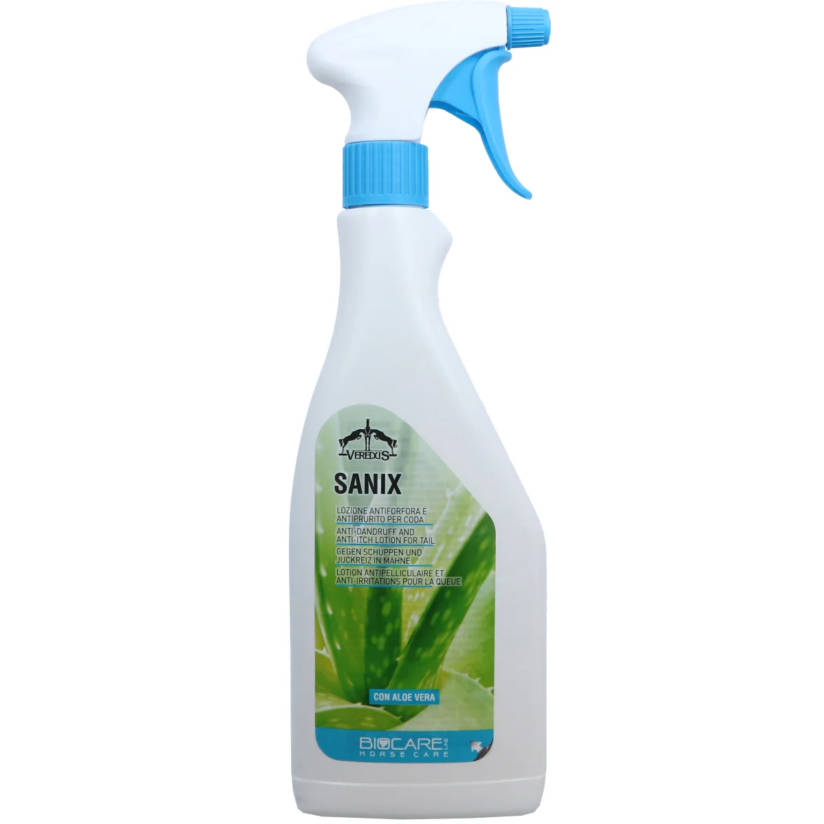 La caspa y algunos tipos de parásitos crean una molesta reacción alérgica en la raíz de la cola que el caballo combate restregándose en las paredes del box. Sanix ha sido estudiada para la normalización del estado higiénico y biológico de la raíz de la crin, eliminando el picor y todas las causas de frotamiento de la cola del caballo.