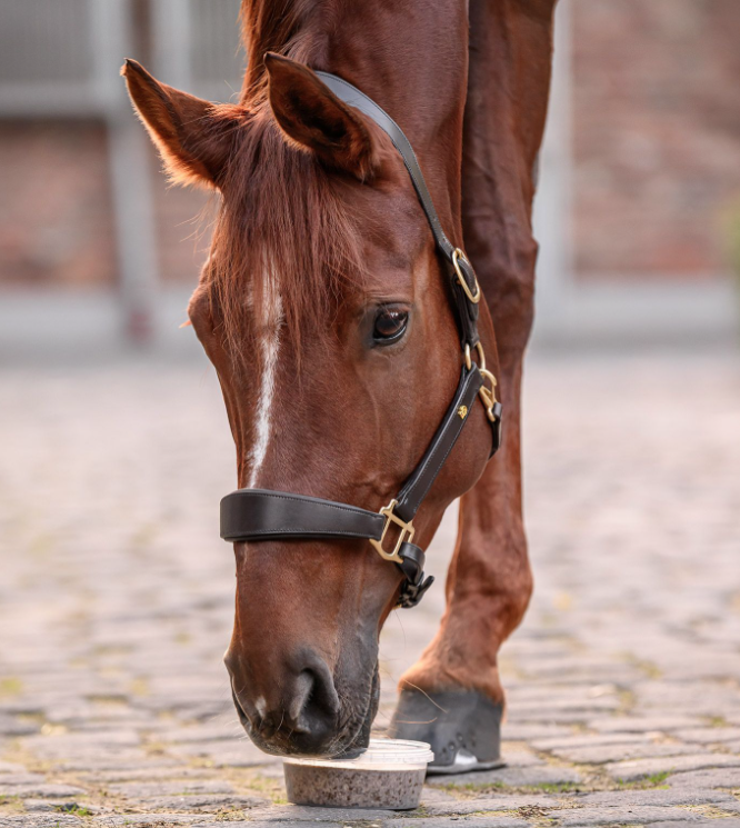 Suplementos alimenticios para caballos. El cuenco para lamer StableSnack es una sabrosa golosina con valiosas hierbas naturales.